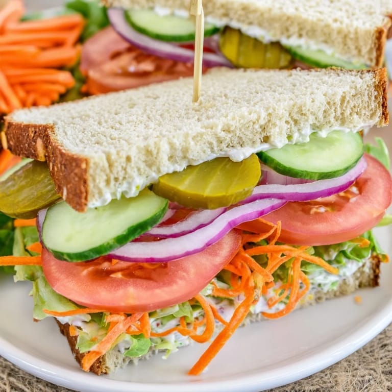 Toast bread slices, spread the creamy mixture evenly, layer pickles and fresh veggies, then top with remaining bread spread side down before slicing.