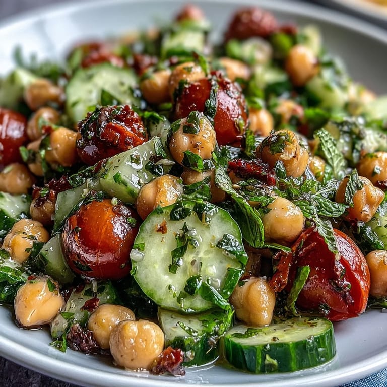 Pin this There's something about a cucumber salad that just feels like summer, even when it's not. I stumbled upon this particular combination on a Tuesday afternoon when my fridge was nearly empty but my farmers market haul was overflowing with crisp vegetables and fresh herbs. The chickpeas came from a forgotten can in the pantry, and somehow tossing them together with a quick lemon vinaigrette felt less like cooking and more like discovering something I'd been wanting all along.