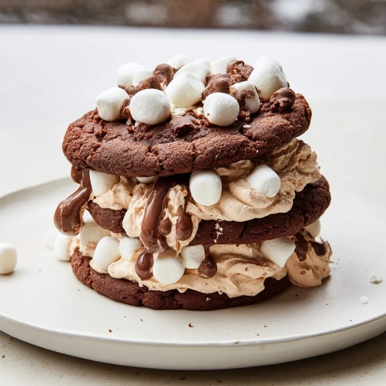 Pin this A playful, decadent dessert featuring layers of chocolate cookies and fluffy marshmallow frosting, stacked to resemble a cozy mug of hot cocoa.