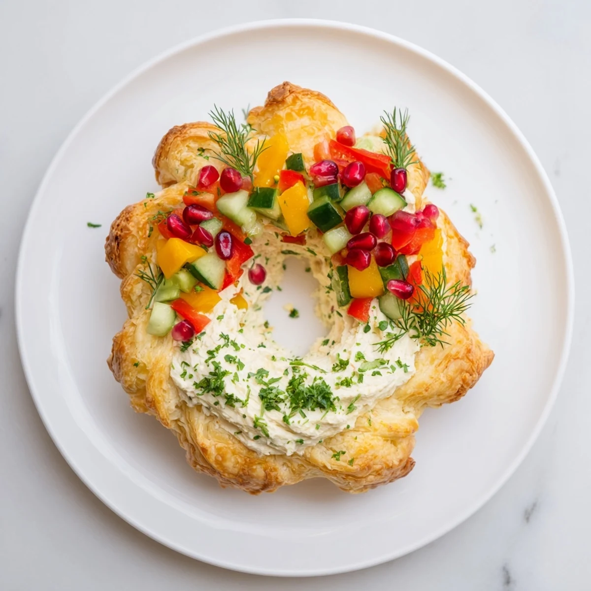 Arrange diced bell peppers, cherry tomatoes, cucumber, and pomegranate seeds on top to resemble a colorful wreath, finishing with microgreens or fresh dill.