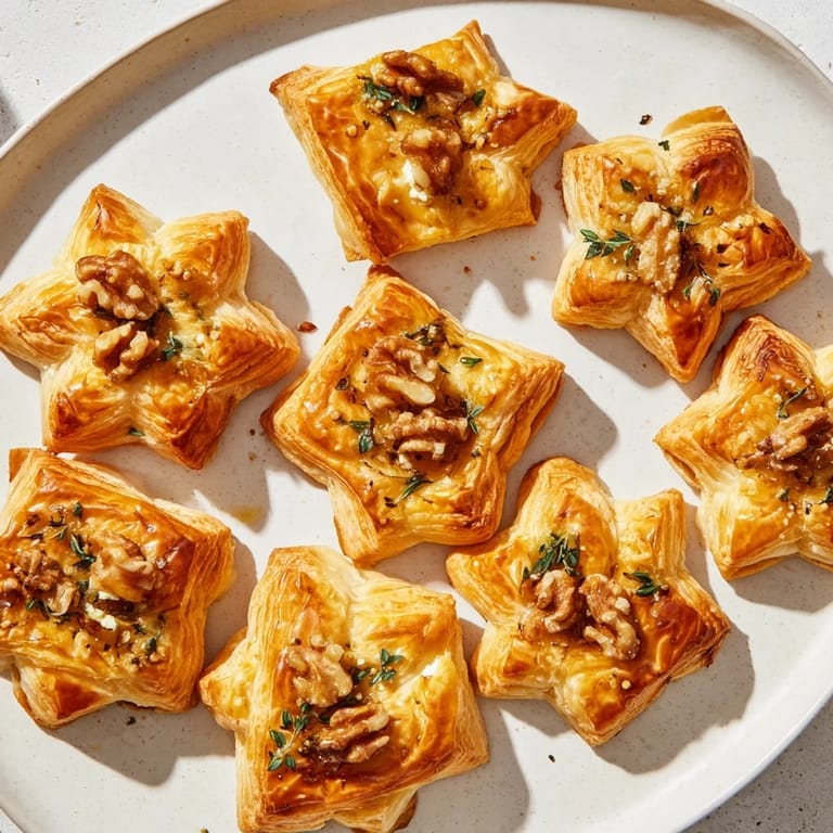 - Star-Shaped Puff Pastry Bites: 1 sheet puff pastry thawed, 1 egg beaten (for egg wash), 50 g goat cheese softened, 2 tbsp honey, 2 tsp fresh thyme leaves, 1/4 cup chopped walnuts